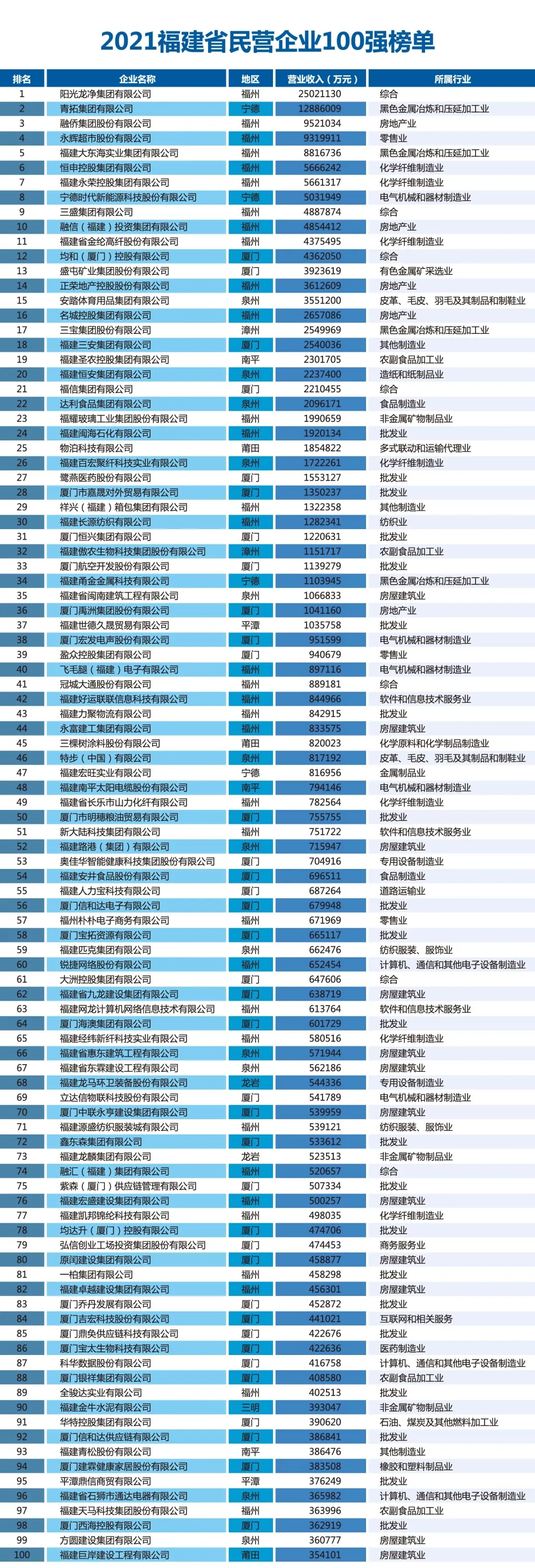 會(huì)上,省委統(tǒng)戰(zhàn)部副部長(zhǎng)、省工商聯(lián)黨組書記李家榮代表省工商聯(lián)發(fā)布了“2021福建省民營(yíng)企業(yè)100強(qiáng)”“2021福建省創(chuàng)新型民營(yíng)企業(yè)100強(qiáng)”“2021福建省民營(yíng)企業(yè)制造業(yè)50強(qiáng)”榜單。“2021福建省民營(yíng)企業(yè)100強(qiáng)”中,廈門恒興集團(tuán)有限公司位列第31位,廈門寶拓資源有限公司位列第58位。